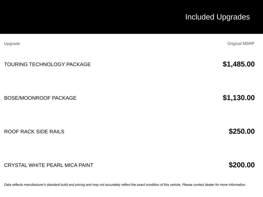• TOURING TECHNOLOGY PACKAGE: Auto Dimming Rearview Mirror w/HomeLink, Navigation System, Auto On/Off Bi-Xenon HID Headlights, Adaptive Front Lighting System (AFS), Smart City Brake Support System, Automatic Rain Sensing Wipers