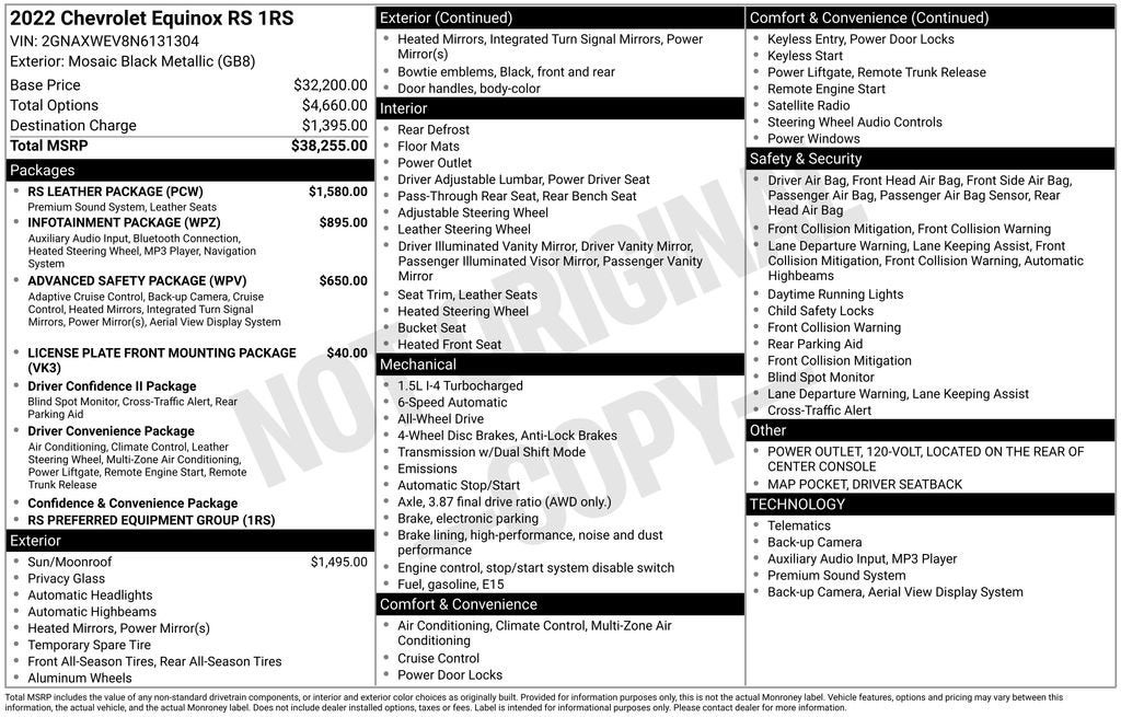 This 2022 Chevrolet Equinox RS comes equipped with a robust 1.5L DOHC engine, paired with a 6-Speed Automatic Electronic transmission and All-Wheel Drive, delivering an impressive 25 city / 30 highway MPG. Adorned in a sleek Black exterior, this Equinox RS exudes a commanding presence on the road.