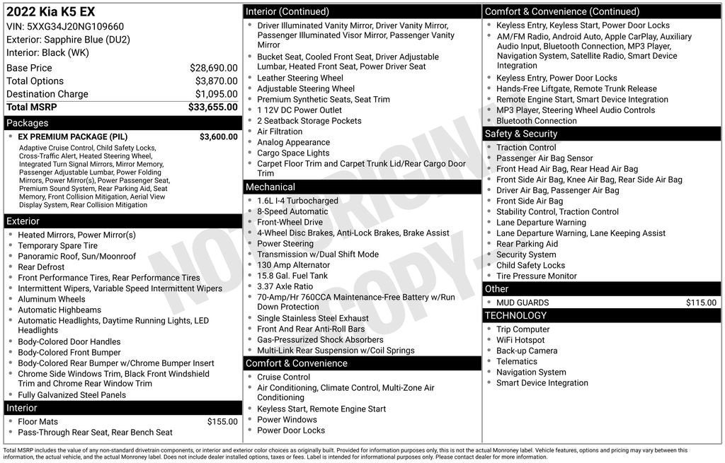 The spacious and well-appointed interior of the K5 EX offers a premium level of comfort and convenience. Enjoy the convenience of the Smart Key with Push-Button Start, the intuitive Navigation system, and the Surround View Monitor that provides a 360-degree view for effortless parking. The Heated Steering Wheel and Heated and Ventilated Front Bucket Seats add an extra level of comfort, while the Carpeted Floor Mats and Mud Guards help maintain the vehicle's pristine condition.