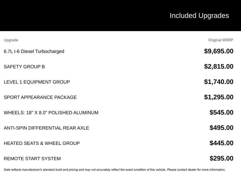 - 6.7L I-6 Diesel Turbocharged (Cummins)