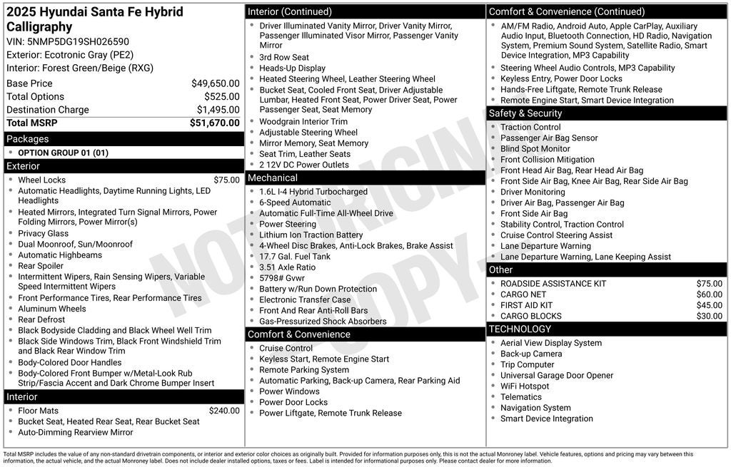 The 2025 Hyundai Santa Fe Hybrid Calligraphy combines style, comfort, and efficiency, making it the perfect choice for discerning drivers. With its sleek Gray exterior and well-appointed interior, this SUV exudes an air of sophistication and refinement. The 6-speed automatic transmission with Shiftronic and the I4 engine deliver a smooth and responsive driving experience, while the impressive fuel efficiency of 35 city MPG and 34 highway MPG will keep you on the road longer between fill-ups.
